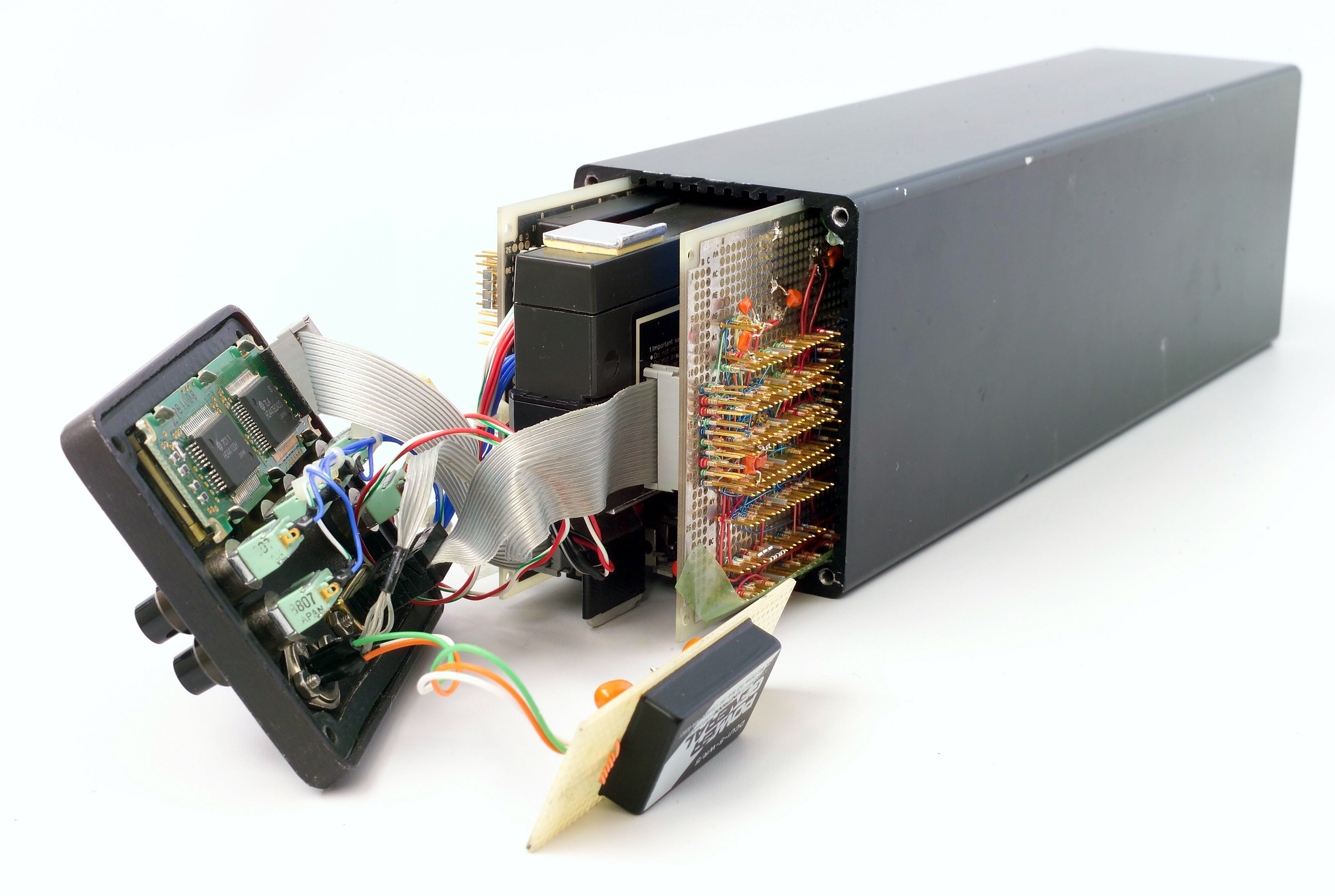 Next, we open the front cover. With the SCSI connector unplugged, it's easy to push the boards out from the back. We can also spot a lead acid camcorder battery nestled in the middle. The little board in the front was a later addition - a power supply for an external video monitor.