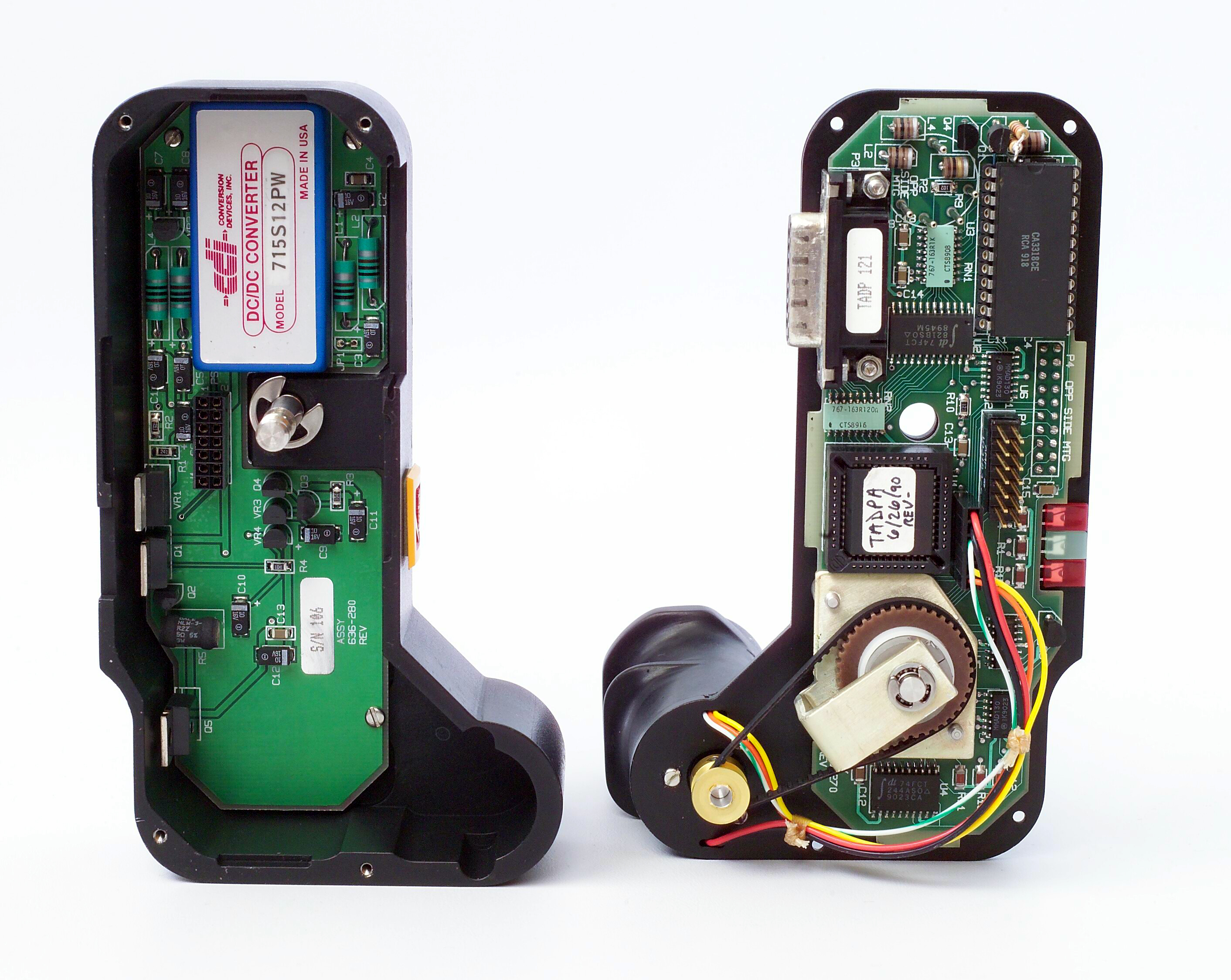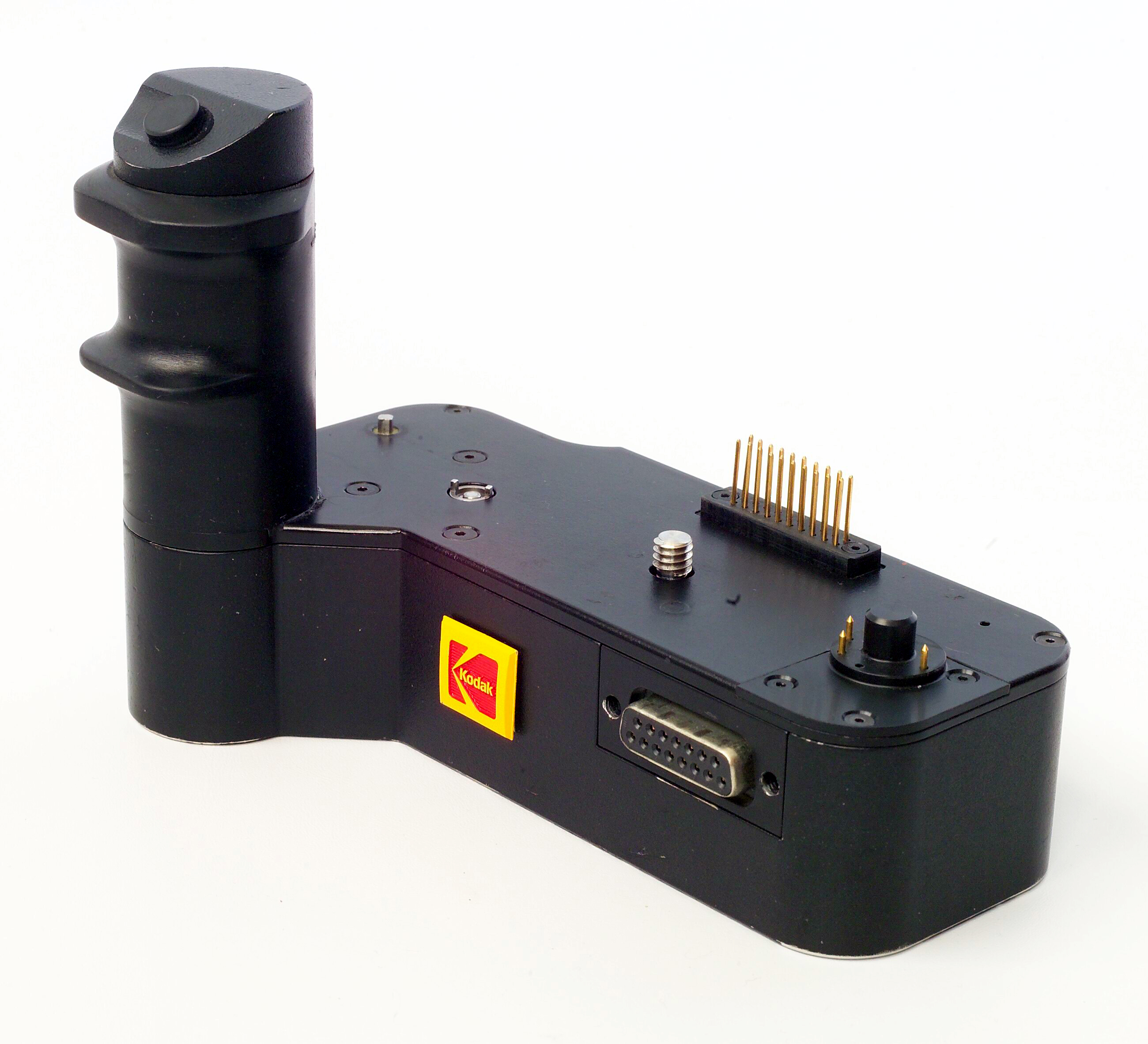 This camera head has a grip with a motor drive inside, unlike the earlier one pictured at the top. We called the motor drive unit the "adapter" before it had a motor in it. The red and green status LEDs are visible on the back, just under the top cover of the adapter. The adapter housing was milled from a solid block of aluminum and was pretty heavy, but still comfortable with a soft rubber finger grip.
